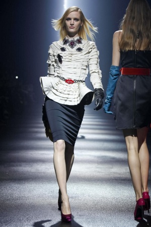Alber Elbaz celebrate 10th years at Label Lanvin. Last night he presented amazing collection show began with rainbow colours. On the catwalk models wore dresses in green, violet, chrome yellow, or rust red colours. Body silhouettes with luxi details made dramatic peats. At the ended collection transformed into rich and glamour lady look. Detail were jewel on sober tops and dresses also fur boas and coats on shoulders. Alber Elbaz inspiration is womanliness and it will be always.